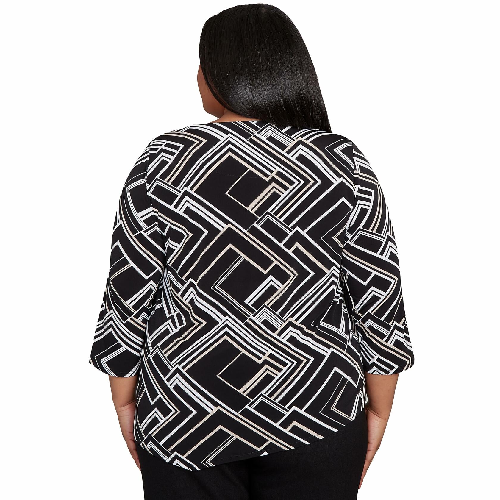 This dynamic geometric textured knit top features a detachable necklace for a versatile look. With three-quarter sleeves and an asymmetrical hemline, it combines modern design with effortless style.