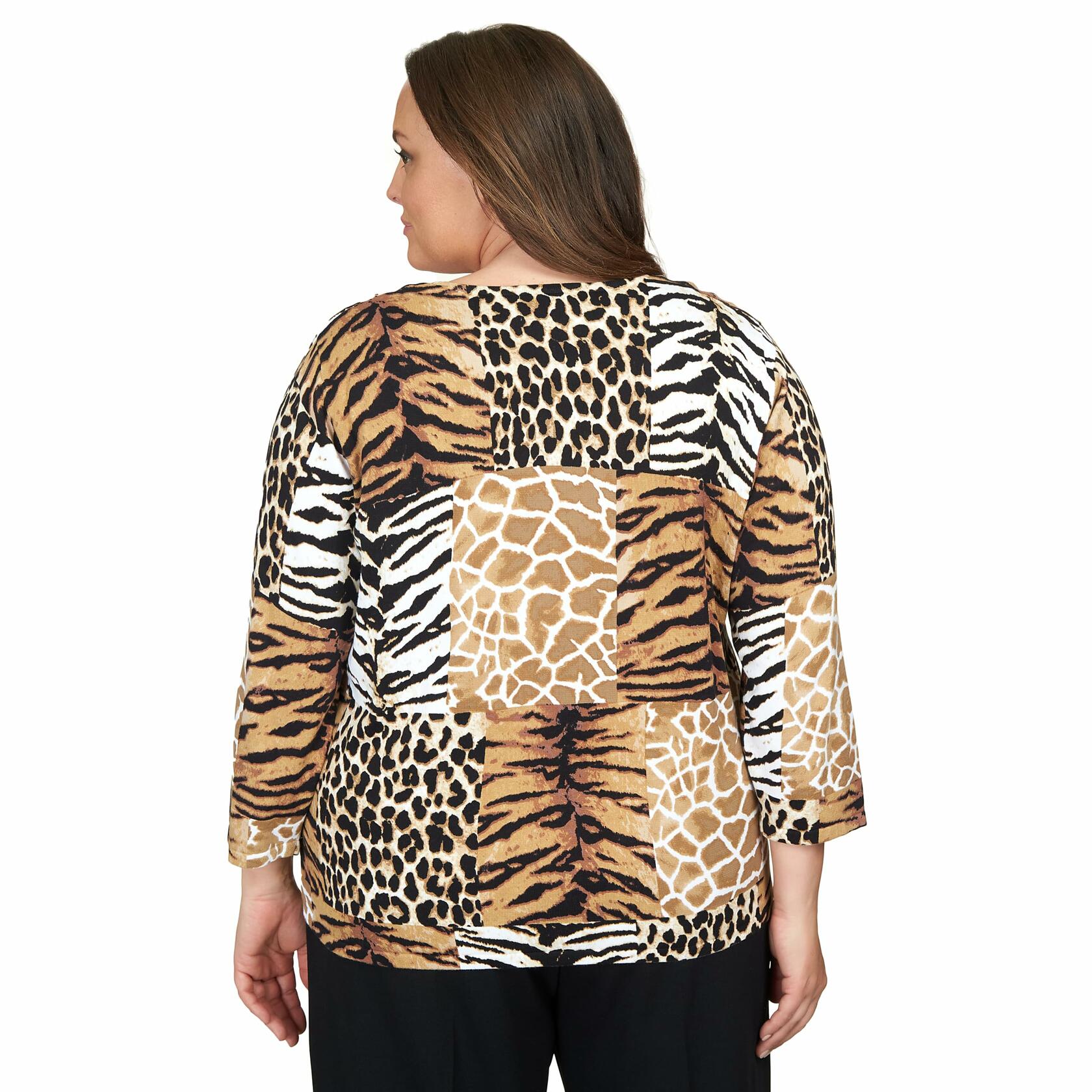 It's time to bring out your wild side in this animal patch print! Featuring a beaded split neck, straight hemline and three quarter length sleeves.
