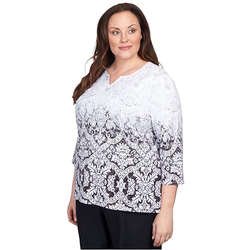 Alfred Dunner Classics Cotton Top Black/White/Grey with Slit Neck Embellished Size 2X