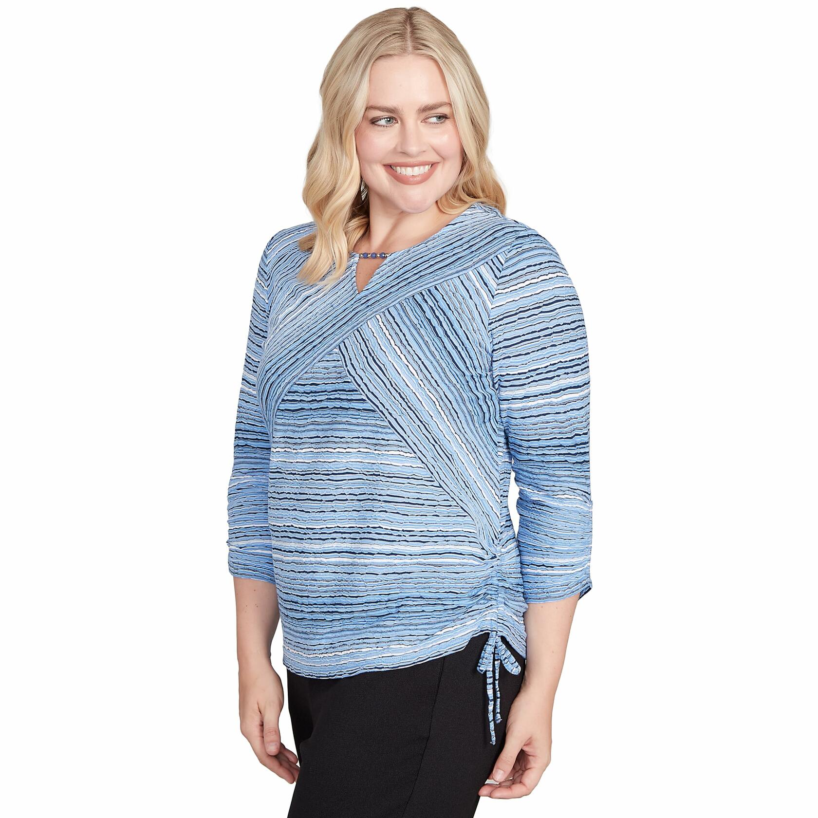 This spliced texture stripe knit top features a beaded keyhole neckline for a touch of sparkle. With three-quarter ruched sleeves and tie-side ruching, it offers a flattering fit and dynamic design for a stylish, comfortable look.