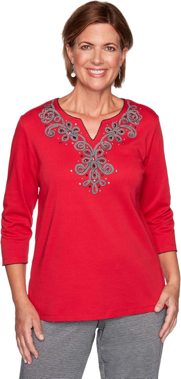 Alfred Dunner Women's Petite Fashion Basic Houndstooth Soutache Yoke Knit Top Size PS Red