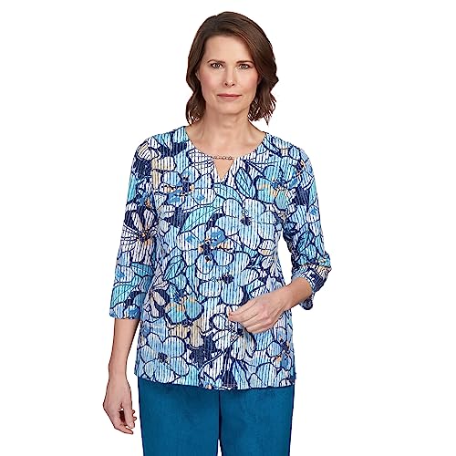 Alfred Dunner Women's Stripe Floral Beaded Split Neck Top Size S Denim