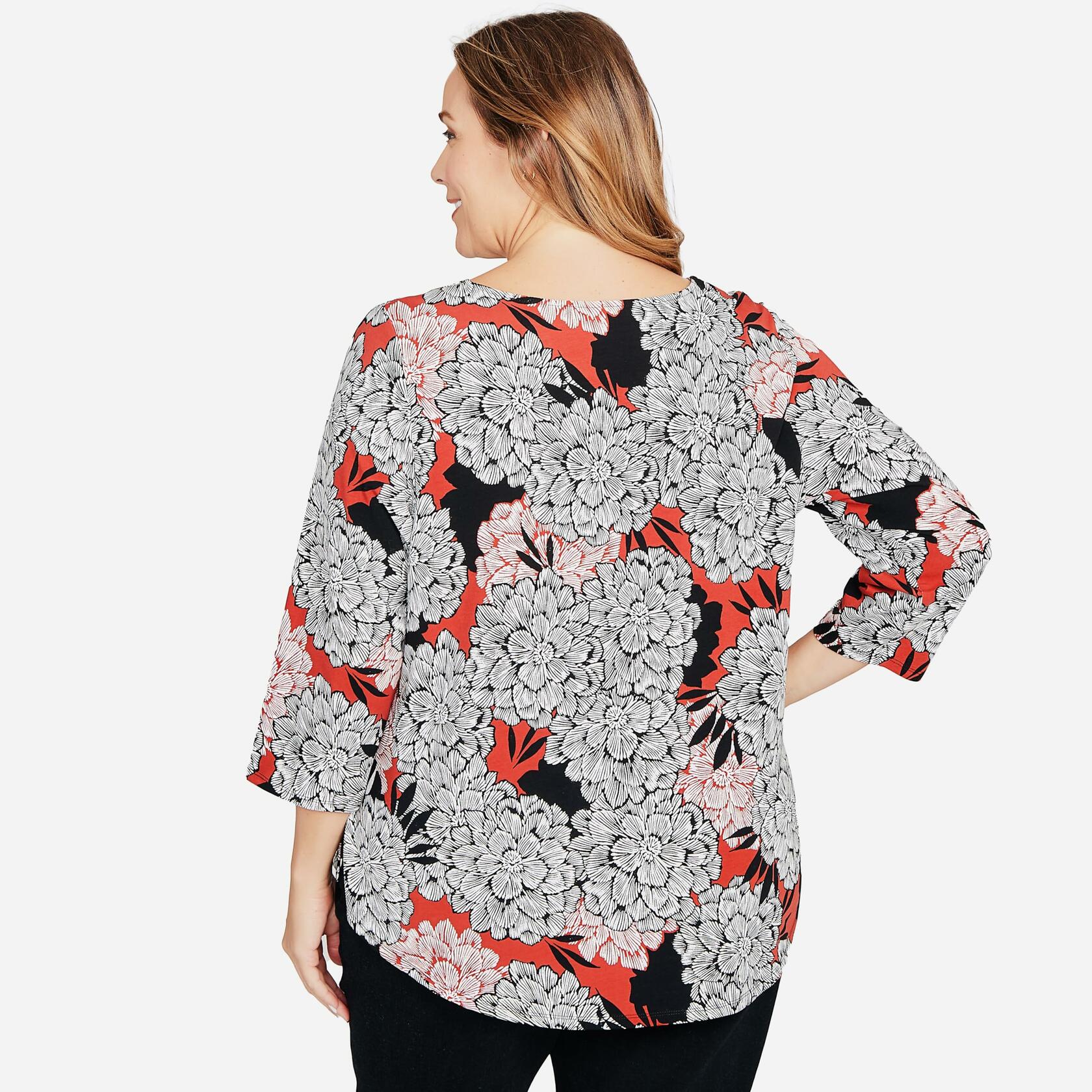 Fresh blooms, easy comfort. This soft cotton-blend knit top features a vibrant dahlia garden print with delicate neckline detailing for an extra touch of charm. Designed with 3/4 sleeves, a scoop neckline, and side slits for easy movement, it's a fresh pick for any day of the week. Fabric Contents 95% Cotton 5% Spandex