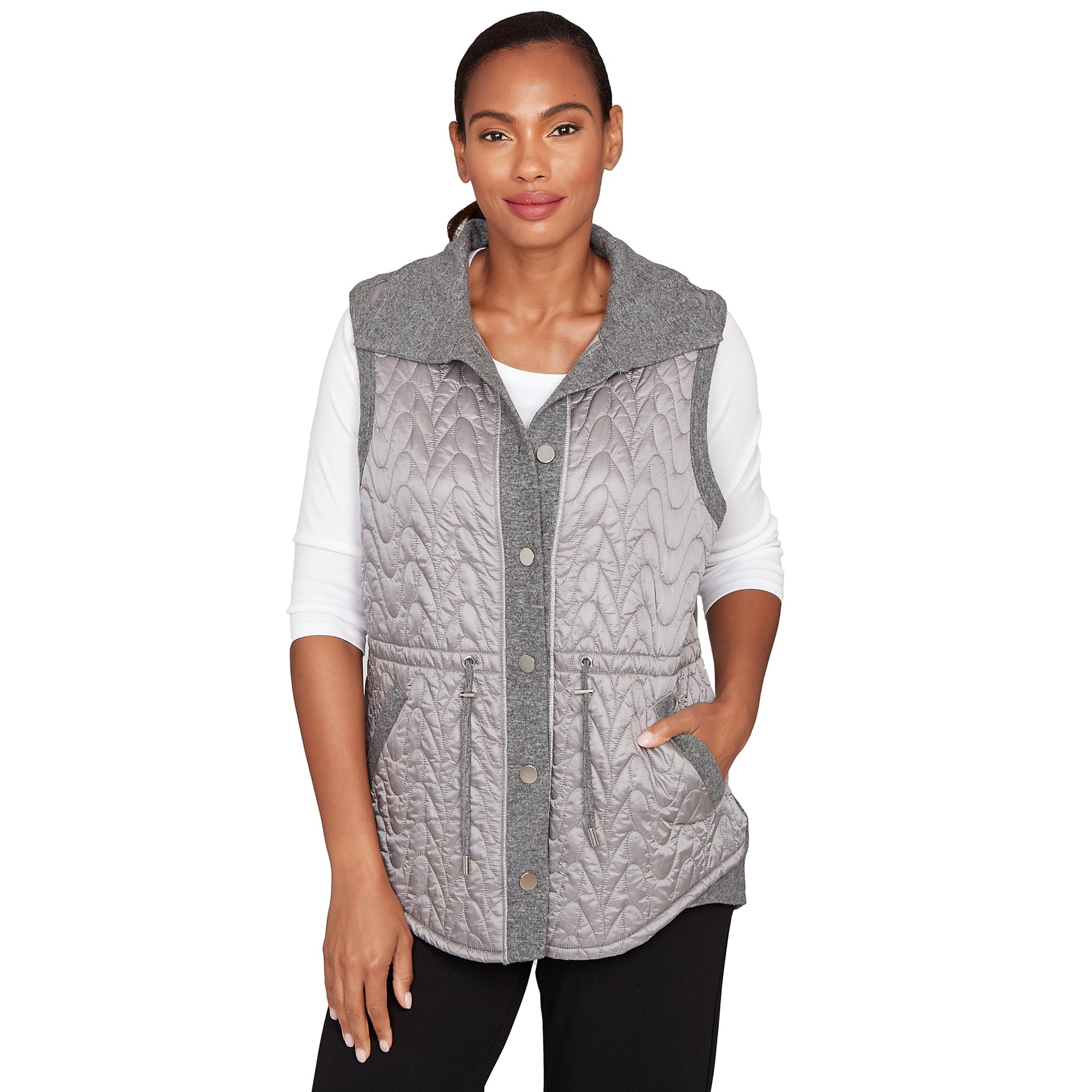 Add lightweight warmth with this quilted vest, styled with a clean button front and classic sleeveless silhouette. The drawstring waist and slit pockets add form and function. Perfect for layering, it blends cozy comfort with everyday versatility. Fabric Contents 100% Nylon & 78% Polyester 19% Rayon 3% Spandex Detailed Care Instructions Machine Wash Cold/Line Dry/Do Not Iron
