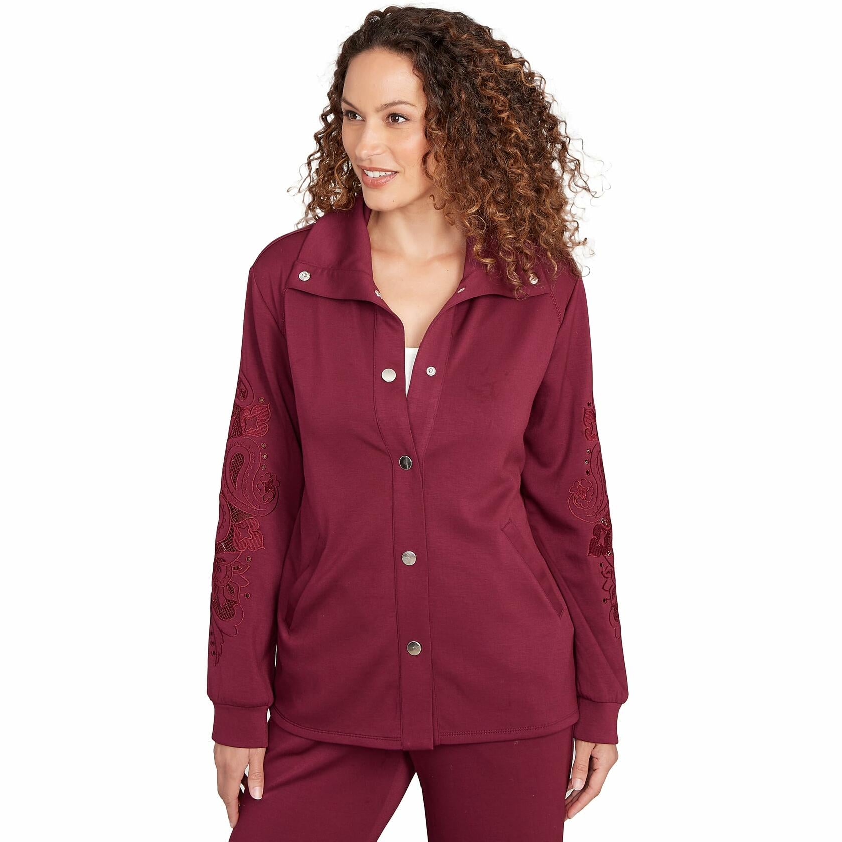 Snap into style! This solid scuba jacket brings chic sophistication with snap-front closure and a unique collar snap detail. The open floral cutouts with delicate embroidery add a touch of elegance, while slit pockets keep it practical. A standout piece that's as comfy as it is stylish.