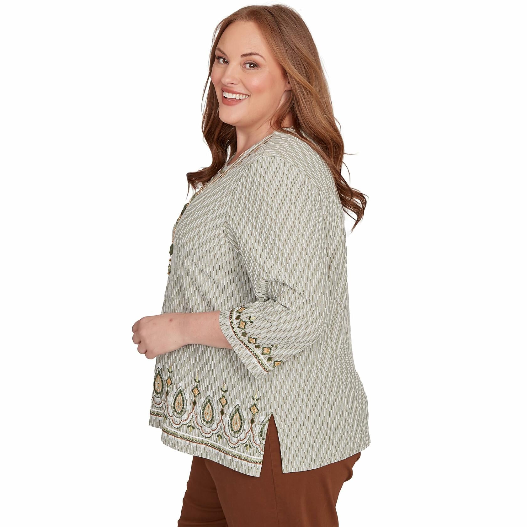 Adorned with an intricate medallion border, this textured knit top brings pattern and charm to every detail-including the hem of its three-quarter sleeves. Complete with a detachable necklace, it offers a polished layered look with effortless appeal.